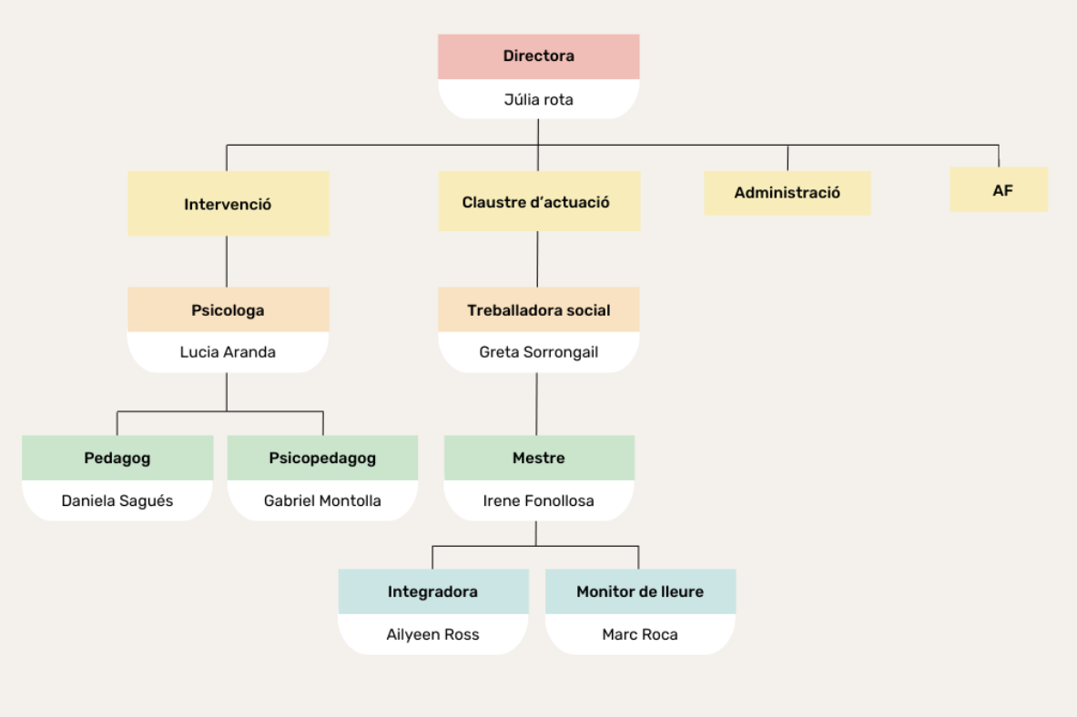 Directora: La Júlia Rota s'encarrega de liderar i gestionar les activitats del centre, adaptant-les a les necessitats dels usuaris. Domina el sistema ESAR de classificació de jocs i selecciona els més adequats segons l'edat i el tipus d'usuari. Organitza i manté l'espai, assegurant-se que jocs, joguines i equips estiguin en bon estat. Fomenta la participació activa dels usuaris en jocs comunitaris i dissenya projectes lúdics que integren i motiven.